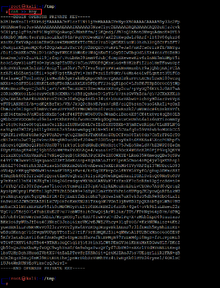 We used the cat command to save the SSH key as a file named 'key' on our attacker machine.