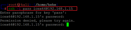 Command used: < ssh –i pass icex64@192.168.1.15 >>