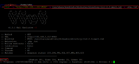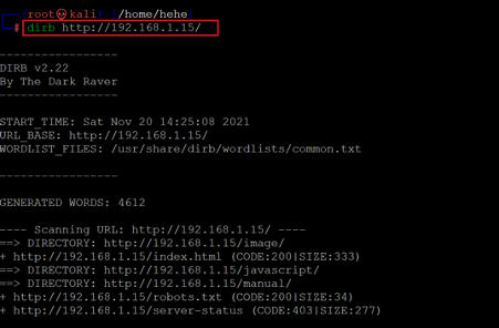 Command used: << dirb http://192.168.1.15/ >>