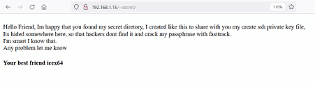 As seen in the above screenshot, we found a hint that says the SSH private key is hidden somewhere in this directory. So, we will have to do some more fuzzing to identify the SSH key. Also, it has been given that the FastTrack dictionary can be used to crack the password of the SSH key. The hint also talks about the best friend, the possible username. So, let us rerun the FFUF tool to identify the SSH Key.