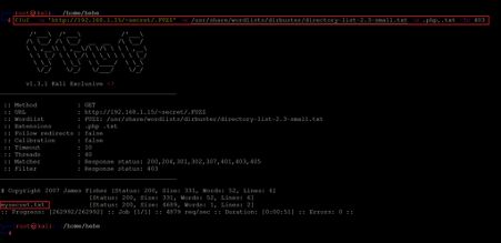 << ffuf -u 'http://192.168.1.15/~secret/.FUZZ' -w /usr/share/wordlists/dirbuster/directory-list-2.3-small.txt -e .php,.txt -fc 403 >>