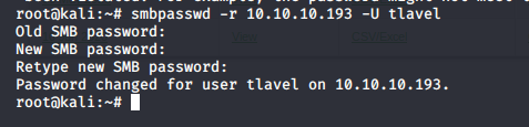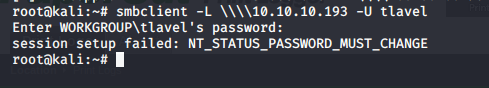 - Let’s try to connect over SMB using user tlavel. We got a password change error.