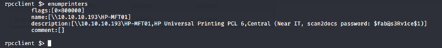 - During the enumeration of printers, we got a password.