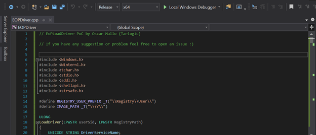 - First the driver file (EOPDriver.cpp) and compile it for x64:
