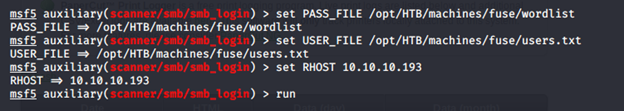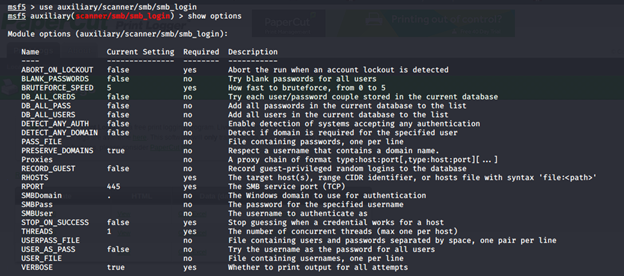 - Now, since the SMB port is opened, we can pass on the username and wordlist to SMB module in Metasploit, as shown below.