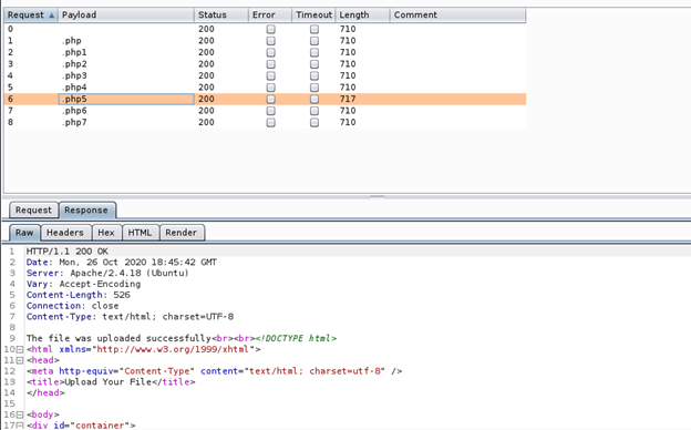 - After triggering, we can see the response length of php5 is different and it shows the message of a successful upload.