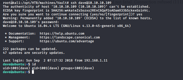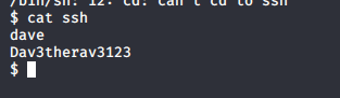 - Using that to SSH as “dave” worked.