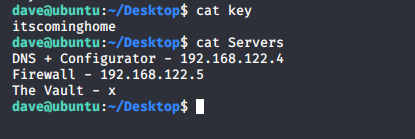 - Continuing the enumeration under Dave’s home directory, we got a key and servers list.