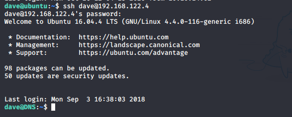 - Let’s try to SSH from Ubuntu to the DNS server as Dave.