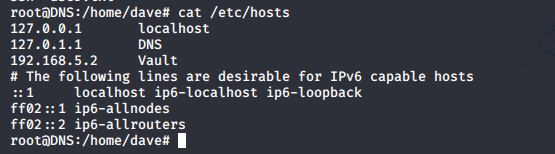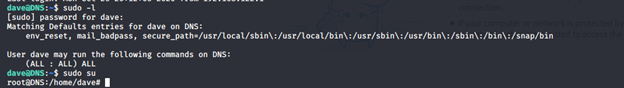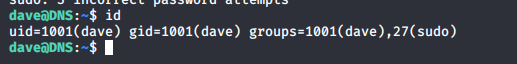 - Once we are in DNS server, then we can see that Dave is part of the sudo group and can execute all as root.