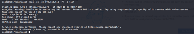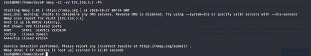 - Enumerating the Vault box from DNS results in the following services hits.