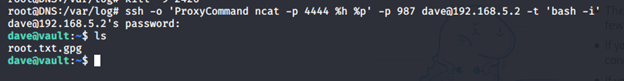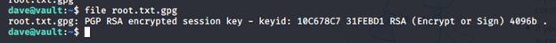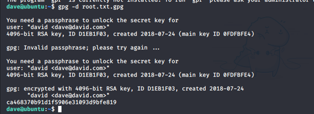 - Once we have the root.txt.gpg locally on the Ubuntu box, we can decrypt it with the key under Dave’s home directory. Finally, we got the root flag.