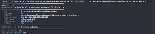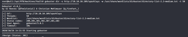 - We’ll add that to the base URL and brute-force the directory names, using Gobuster.