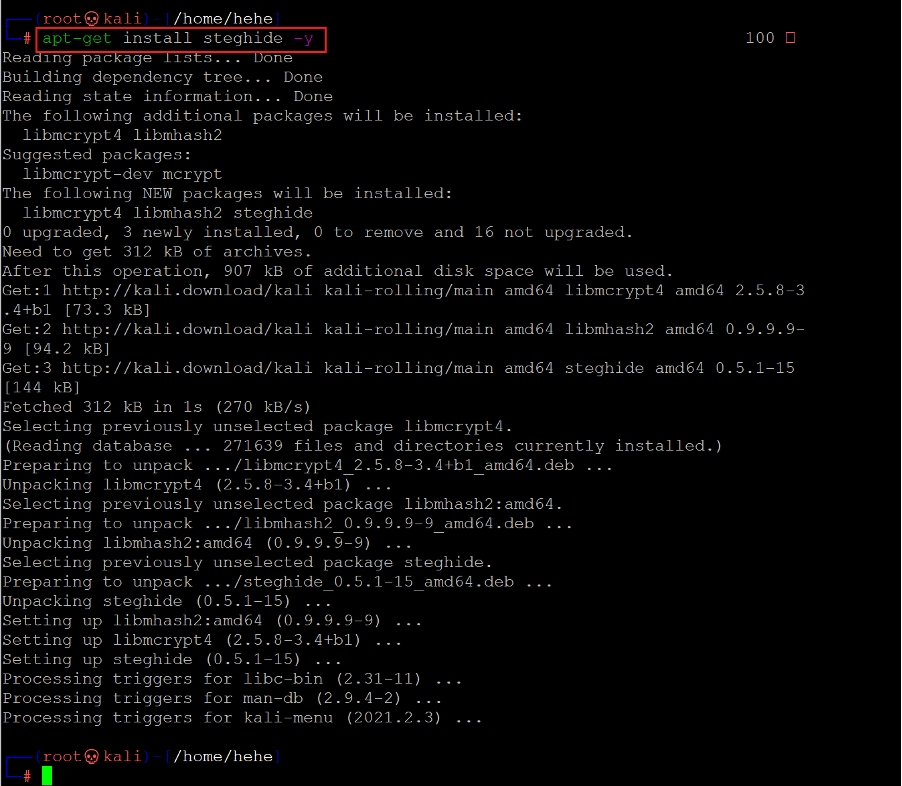 In the above screenshot, we have downloaded the 'steghide' tool with the help apt-get command. We spent some time learning about the tool usage and commands on the official website. Let us now extract the image file data using the steghide command, which can be seen below.