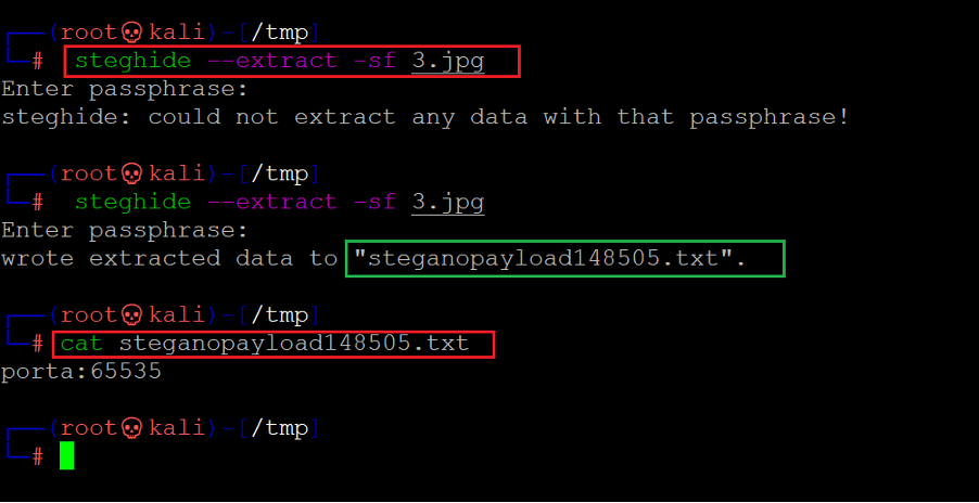 At first, it seemed that the data was not extracted since it asked for a passphrase. We did not know any passphrase but provided any default value, and it gave a failed message. We tried again, and this time we left the passphrase value empty and just hit the enter button. The data was extracted successfully, as can be seen in the above screenshot. We used the cat command to open the file, and as a result, we got another number. Now, we know two numbers found through various hints on the target machine.