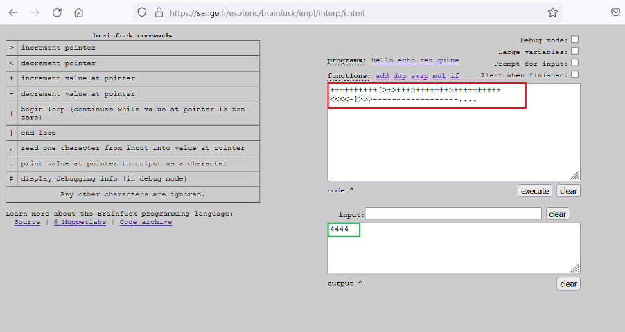 Here we found one more encoded message. This seems to be encoded using brainfuck programming language. We found an online decoder that supports the brainfuck algorithm, which can be seen below.