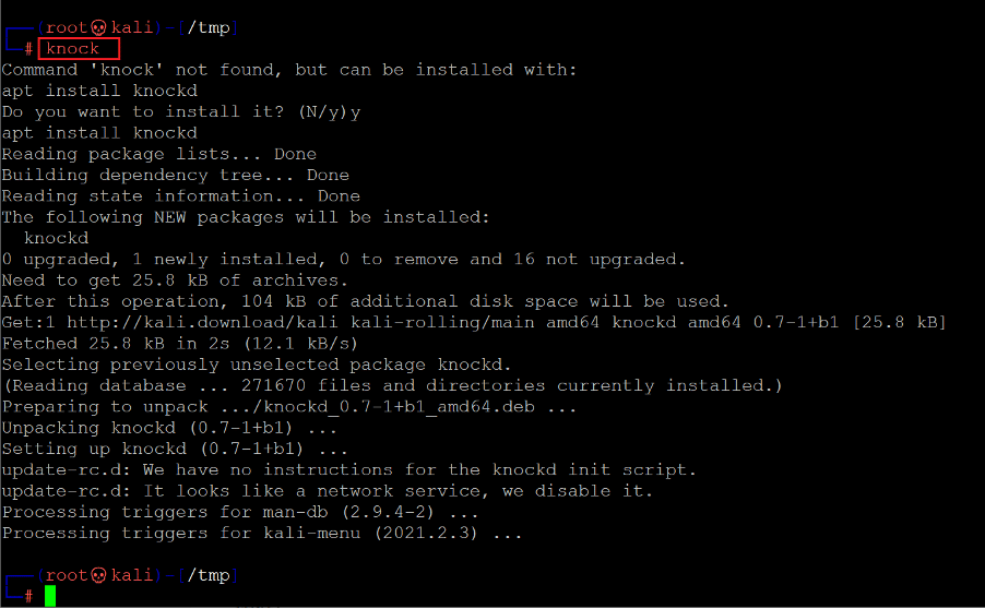 The Knock utility was not pre-configured in Kali Linux, but when we typed the knock command on the terminal, it automatically gave an option to install it. We typed y for yes, which installed the knock utility on our attacker machine. Kali automatically identified the utility package and installed it as we are using the latest kali Linux version. In the previous versions, it can be installed by using the apt-get install knock command.