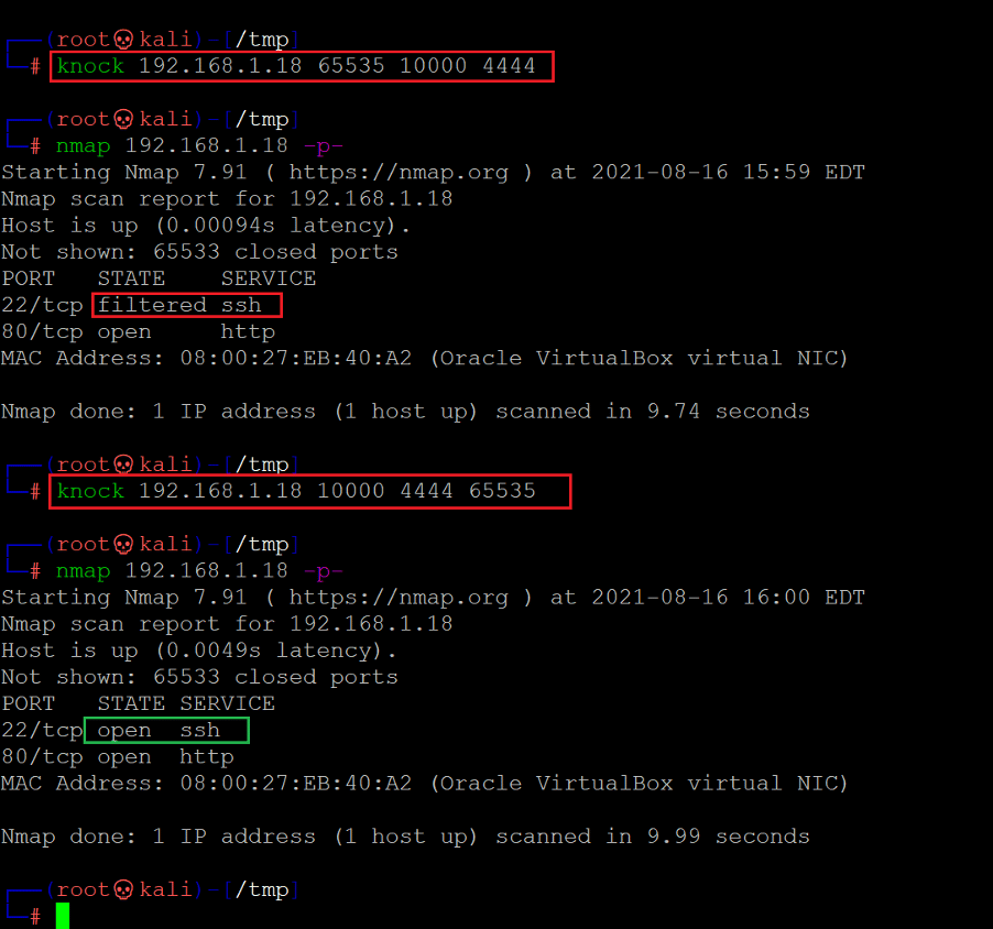 We ran the knock sequence on the target machine to open the state of the ports. After that, we conducted a port scan, and port number 22 was still shown as filtered. We again ran the port knocking command, but this time we changed the sequence of the numbers. After that, we conducted the Nmap scan to check the open ports, and the SSH port was now changed to open. This shows that port knocking was successful, and we can now enumerate the target machine through port 22.