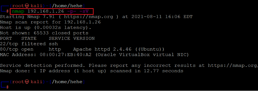 Command used: << nmap -sV -p- 192.168.1.26 >>