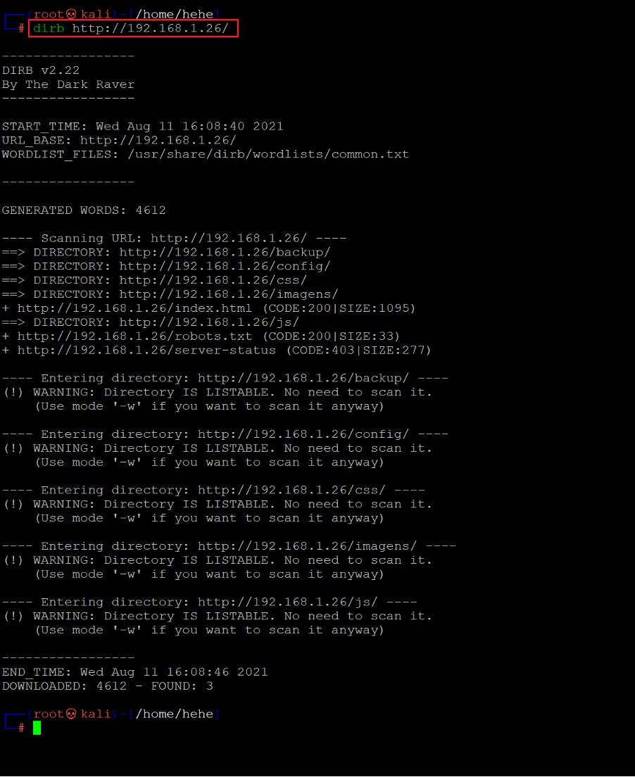 As we can see, there is just a simple image file on the homepage. But as the port is open, there must be some application folder in the 'HTML directory. Let's run brute force to identify any hidden directories or files. We used the Dirb tool for this purpose. It is a very popular and efficient web application brute-forcing tool. The command used and the scan results can be seen highlighted in the below screenshot.