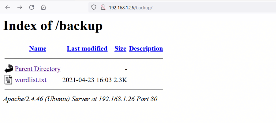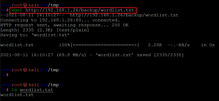Command used: << wget http://192.168.1.26/backup/wordlist.txt >>