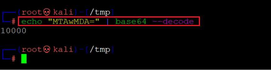 Command used: << echo “MTAwMDA=” | base64 --decode >>