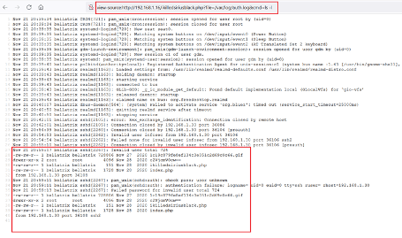 In the above screenshot, we added the PHP code execution code as username in the SSH login command. On the login terminal, the server returned a login failed error. However, when we checked the log file, we found that the command entered as the username was successfully saved on the server log file. Let us verify the same by running the ls command through the cmd get parameter in the URL.