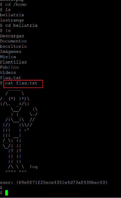 We executed the reverse proxy shell payload on the target machine, and after some time, we reviewed shell access on our attacker machine NetCut terminal. After gaining access to the target machine, we checked the user folder 'bellatrix' to find our first flag.