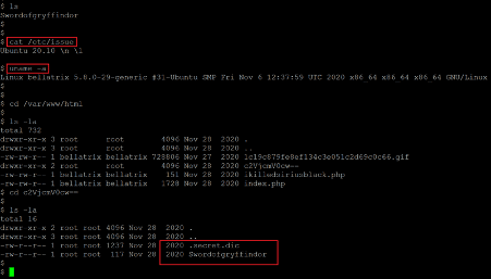 As seen above, we used the first two commands to identify version information about the operating system and kernel version. The version information is given in the above screenshot. We researched the identified versions for known vulnerabilities. However, nothing interesting could be found. We checked the contents of the document root directory by running the 'ls -la' command, where we identified two interesting files which could be helpful in further solving the challenge.