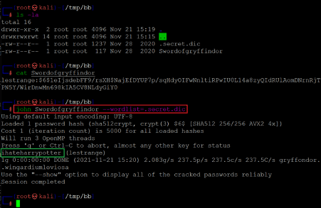 Command used: << john Swordofgryffindor --wordlist=.secret.dic >>