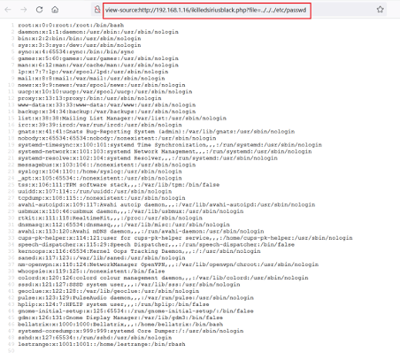 As seen above, the 'etc/passwd' file contents are displayed on the browser. This confirms the local file inclusion vulnerability. In the next step, we will exploit the local file inclusion (LFI) vulnerability to gain further access.