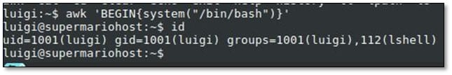 After doing some research on Google with the allowed commands on how to spawn a shell, we found the by using awk with the following command: awk 'BEGIN{system("/bin/bash")}'
