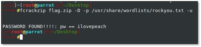 We ran fcrackzip with rockyou.txt file, and we found the password: ilovepeach
