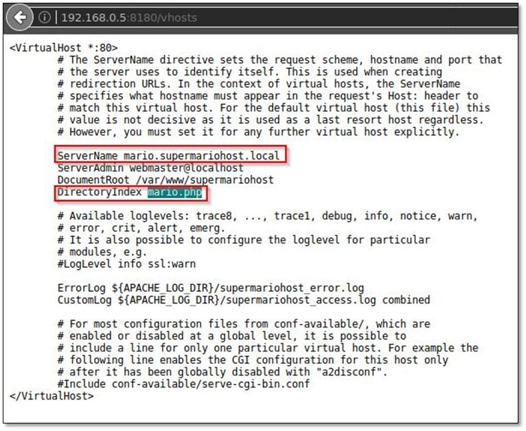 It was a virtual host file with server name and directory indexing from which we found that application served PHP based language. We added mario.supermariohost.local to /etc/hosts :