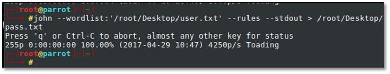 On the basis of the usernames we also created password list from JohnTheRipper by using the following command: john –wordlist:<user_listfile> --rules –stdout > /root/Desktop/pass.txt
