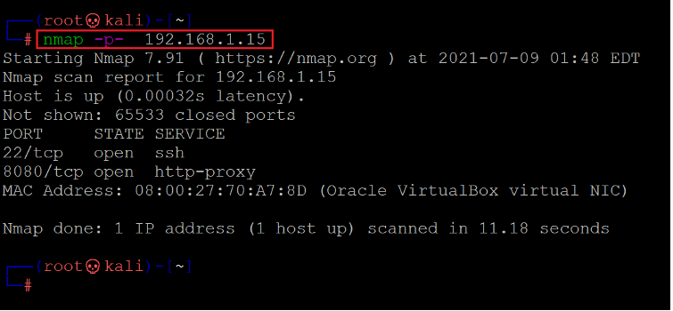 The Nmap output shows two ports on the target machines that have been identified as Open. In the Nmap command, we used the '-sV' switch for version enumeration. We also used the '-p-' option for a full port scan. It tells Nmap to conduct the scan on all the 65535 ports on the target machine. By default, Nmap conducts the scan only on known 1024 ports. So, it is especially important to conduct a full port scan during the Pentest or solving the CTF for maximum results.