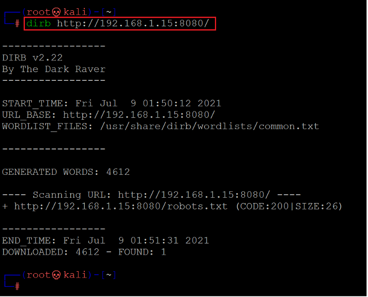 As can be seen above, there is certainly some web application running on the target machine, but we just got a message displayed on the screen that it is under development. We decided to check internal files and folders by running a file enumeration tool for web applications. We used the dirb web directory scanner for this purpose which is a default utility in Kali Linux. The scan results and output can be seen below.