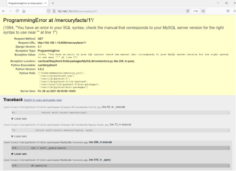 When we tried to access the admin section on the target application, the application responded with the above errors. As debugging was enabled, we found the detailed error information where we found a path to another folder on the target application. So, let's access the identified folder "mercuryfacts/" on the browser.