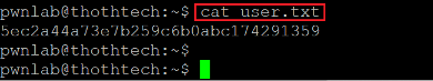The login was successful, and we are now logged into the target machine as user pwnlab. However, the goal of the CTF is to gain root access to the machine. From here, we will try to analyze various configurations and file them in the target machine to escalate user privilege. When we checked the files in the current user directory, we found our first flag named 'user.txt,' which can be seen below.