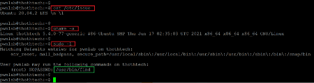 We ran a few commands to enumerate the target machine operating system and kernel version information. The version information can be seen in the above screenshot, we searched over the web for an available exploit for the installed versions, but none could be found useful for our case. We then used the sudo –l command to check the sudo permissions for the current user and identified that the 'find' command could be run as root. So, let's execute the find command to gain root access.