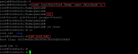 In the above screenshot, we can see that we executed the find command to escalate user privilege. After executing the command, we used the 'id' command to check the current user. The output confirms that we are now logged in as root. We then checked the current directory, and there we found the root flag. The flag file 'root.txt' can be seen reading in the above screenshot. This completes the challenge; we have gained root access and read both the flags.