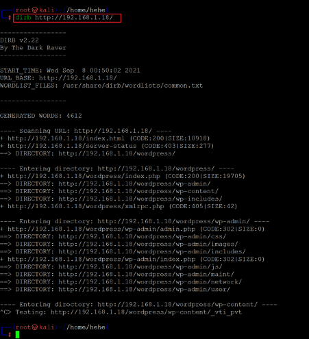 The Dirb output shows that there is a WordPress application running on the target machine. The Dirb scan also identifies a WordPress admin panel. As we know, WordPress is an easy target to identify vulnerabilities.