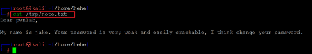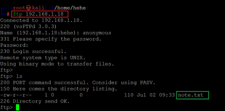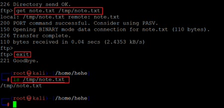 In the above screenshot, we used the FTP command to login into the FTP service. We found that the anonymous user was available for login and so we could easily log in by entering 'anonymous' as both username and password. After logging into the FTP service, we used the 'ls' command to check the current directory contents. We found an interesting file named 'note.txt.' We decided to download this file for further analysis on our attacker machine, which can be seen below.